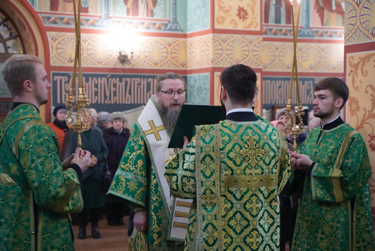 Его Преосвященству сослужили: благочинный Белозерского округа, настоятель храма Успения Пресвятой Богородицы г.Белозерска протоиерей Александр Стулов; настоятель храмового комплекса святителя Николая Чудотворца г.Череповца протоиерей Владимир Беляев; благочинный Устюженского округа, настоятель храма Казанской иконы Божией Матери г.Устюжны протоиерей Константин Лобанов; настоятель храма Рождества Христова г.Череповца протоиерей Сергий Сергеев; благочинный Кадуйского округа, настоятель храма преподобного Филиппа Ирапского п.Кадуй иеромонах Агафангел (Бреднев); заведующий канцелярией Череповецкой епархии, настоятель кафедрального собора преподобных Афанасия и Феодосия Череповецких иерей Сергий Бондарь; руководитель епархиального отдела по церковной благотворительности и социальному служению, ключарь Архиерейского подворья Воскресенского собора г.Череповца иеромонах Нил (Хоменец); клирик Воскресенского собора г.Череповца иерей Сергий Мельник; клирики кафедрального собора преподобных Афанасия и Феодосия Череповецких протоиерей Антоний Добош и иерей Александр Шурпо.
