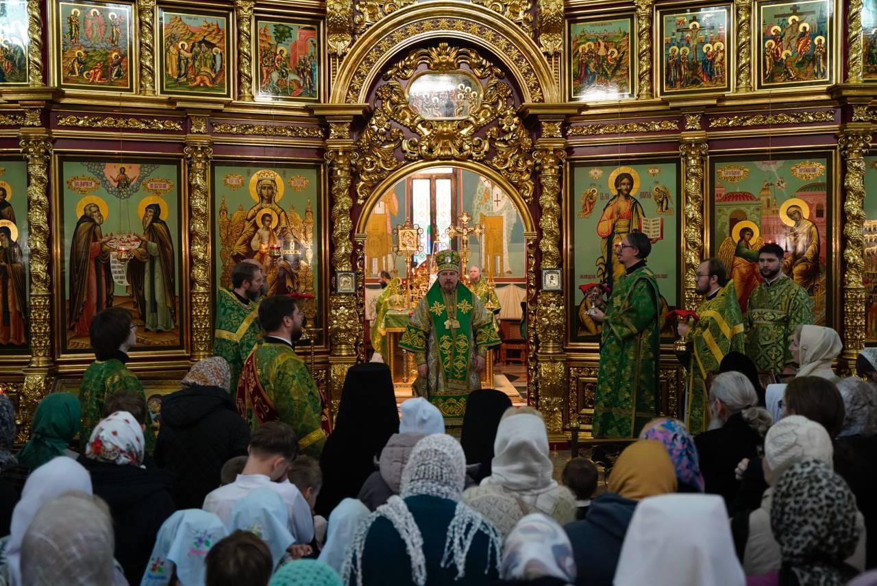 Совершение поздней Божественной литургии в верхнем Благовещенском храме возглавил митрополит Вологодский и Кирилловский Савва. Его Высокопреосвященству сослужили архиепископ Бежецкий и Удомельский Каллистрат, епископ Великоустюжский и Тотемский Фотий, епископ Североморский и Умбский Тарасий, епископ Череповецкий и Белозерский Игнатий; секретарь Череповецкой епархии, почётный настоятель кафедрального собора города Череповца митрофорный протоиерей Александр Куликов; заведующий канцелярией епархиального управления, настоятель кафедрального собора преподобных Афанасия и Феодосия Череповецких иерей Сергий Бондарь; благочинный Устюженского округа, настоятель Казанского храма г.Устюжны протоиерей Константин Лобанов; настоятель храмового комплекса святителя Николая Чудотворца г.Череповца протоиерей Владимир Беляев; настоятель храма Рождества Христова г.Череповца протоиерей Сергий Сергеев; руководитель отдела по работе с молодёжью Череповецкой епархии, настоятель храма преподобного Сергия Радонежского г.Череповца иерей Роман Зайцев; духовник Череповецкой епархии, клирик храма Рождества Христова г.Череповца протоиерей Олег Кочубей; руководитель отдела по социальному служению и благотворительности Череповецкой епархии, ключарь Архиерейского подворья Воскресенского собора г.Череповца иеромонах Нил (Хоменец); руководитель отдела по работе с молодёжью Вологодской епархии иерей Михаил Максимов; насельник Спасо-Прилуцкого монастыря иеромонах Илларион (Свиридов); священнослужители Великоустюжской и Череповецкой епархий.