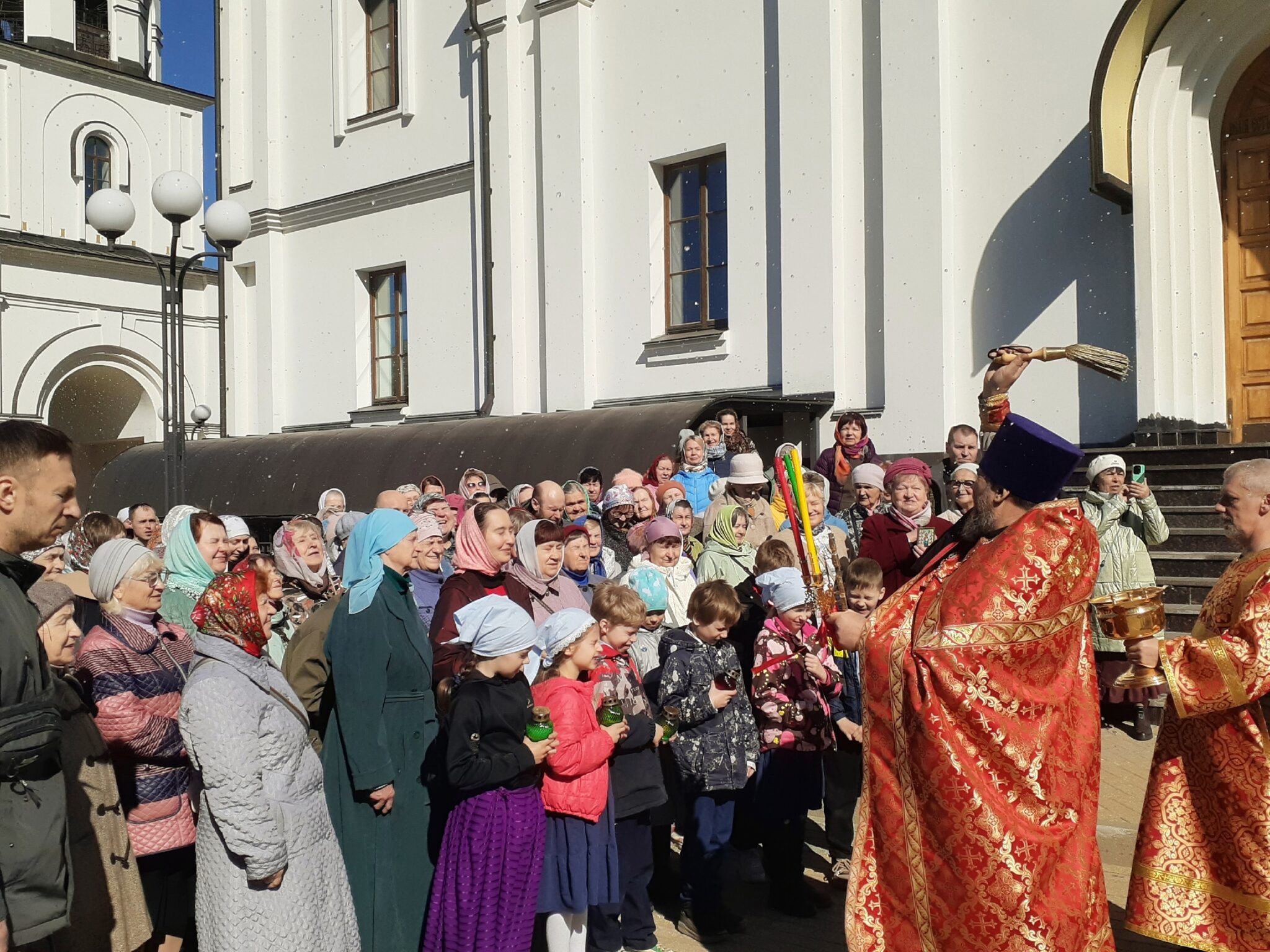 Во время остановок крестного хода священнослужители с благовестием о Воскресении Христа щедро окропили прихожан святой водой.